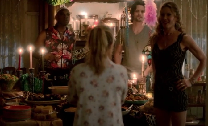 Sookie awakens the following night to the sound of banging in her front yard. She looks out of the window to see Jackson loading items onto his pickup truck. She saunters downstairs in her robe to see dozens of candles lit, and a banquet of food on the dining room table. Jackson enters the house and tells her that he has packed up all of Alcide's items and, when she was ready, they would sort through Alcide's belongings at a later date. Lafayette, James, and Jenny cheerfully walk in. Sookie asks why they have prepared so much food. Lafayette tells her that they are throwing a celebration party that very night, and Jenny had spent most of the day cooking in preparation for it. Sookie is incredulous that they would throw a party in her house without asking her permission, and especially while she is in mourning. Lafayette explains to her that this party was their way of healing, and that they needed to celebrate life rather than dwell on death. He goes on to say that the rules of the party were that each invitee is required to bring alcohol, and that offering condolences is strictly forbidden. Lafayette, James, Jackson, and Jenny return to the kitchen to continue preparing for the party. At this point, there is a knock at the door; it is Bill, who calls out Sookie's name. Slightly annoyed that she is the last to know about her party, Sookie opens the door to a confused Bill, who was expecting Sookie to be dressed. Sookie replies that she has just found out about her party. Bill states that he has no alcohol, as per the rules of the party, but his gentile mother had taught him never to arrive at a party without a gift, and awkwardly hands Sookie a bouquet of flowers. Sookie accepts the flowers and invites Bill in, and then heads upstairs to get ready for the party.