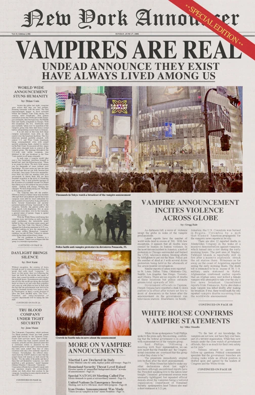 Since the Great Revelation, vampires have been trying to influence human politics through organizations such as the American Vampire League, in order to campaign for equal rights, such as vampire-human marriage.